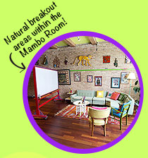 The Mambo Room is filled with plenty of positive vibes and will immediately lift your spirits. As one of our mid-sized rooms with 1,100 sq. ft. of meeting space, the room is decked out with beautiful cherry wood floors, plenty of sunlight and happy blue and green tones. Enjoy a cup of coffee or have a small group breakout session in the sunny couch grouping nestled by the windows or in one of the other three breakout groupings.