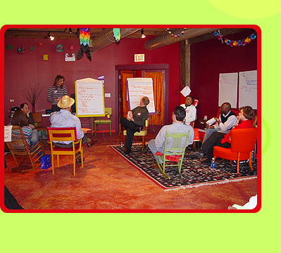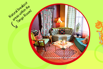 The mix of deep red and exposed brick walls in the Tango Room offers clients 700 sq. ft. of warmly rich and cozy space, perfectly suited for smaller sessions at Catalyst Ranch. The main seating area can easily accommodate groups of 10-20 participants whether in a theater or a café set-up. In addition, there are two natural breakout areas in the Tango: one at a table and chair set, the other at a couch grouping in front of a large wall of windows. The two large painted walls are perfect for ideation sessions and posting notes. A plasticore sheet can be added for additional posting space on the brick wall. A projector screen is hung from the ceiling and can be transferred to one other wall for flexibility and unique room setups.